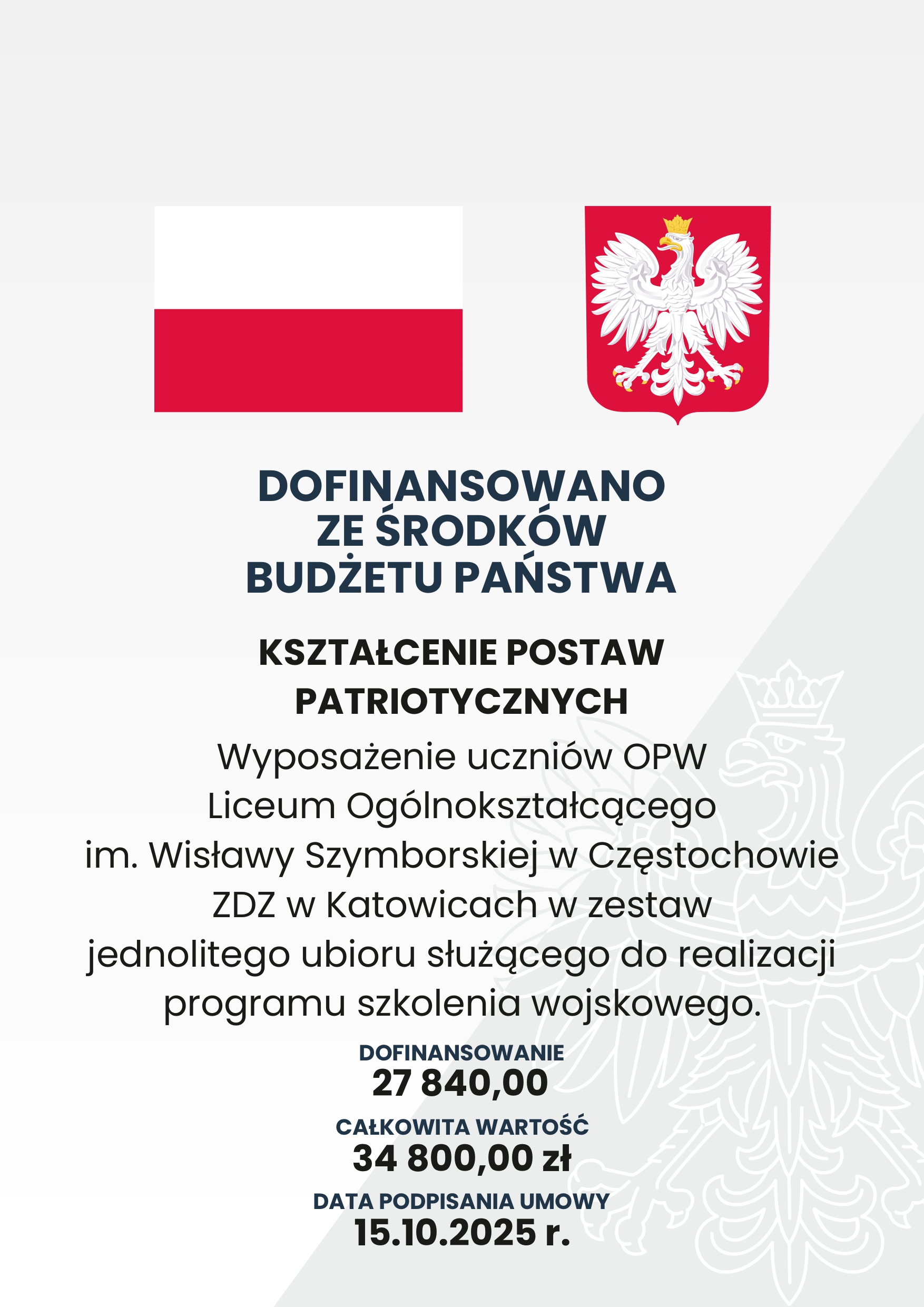 Nazwa projektu: Wyposażenie uczniów OPW Liceum Ogólnokształcącego im. Wisławy Szymborskiej w Częstochowie ZDZ w Katowicach w zestaw jednolitego ubioru służącego do realizacji programu szkolenia wojskowego.